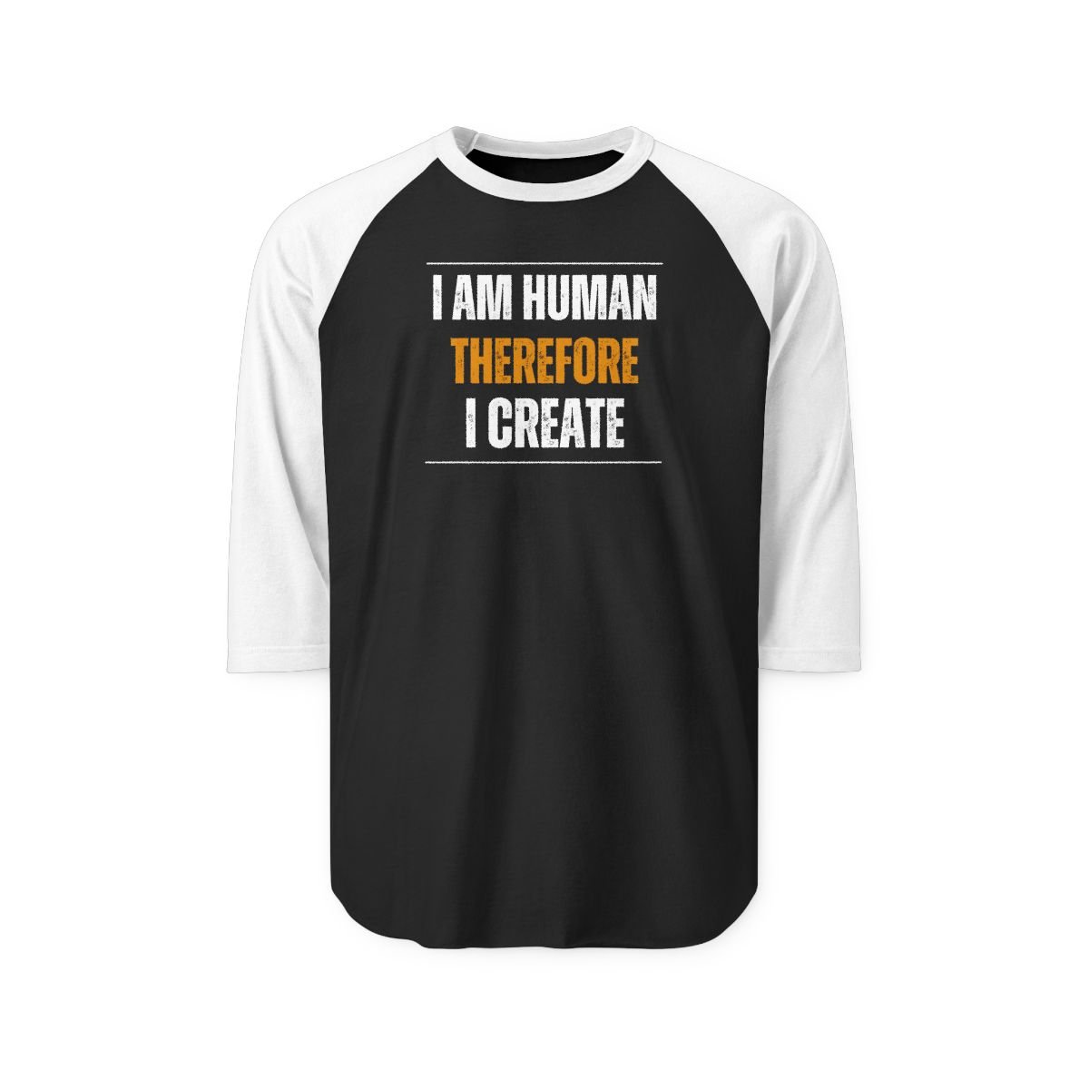 A stylish Unisex Three-Quarter Sleeve Raglan Shirt, the perfect blend of comfort and style. It features the empowering message "I am Human Therefore I Create".